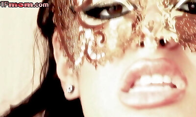 Curvy masked milfs sucking in three way before riding cock