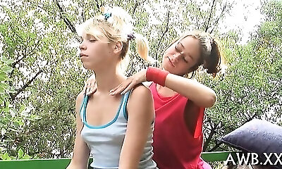 Elderly gal watches two teen lesbians caressing each other