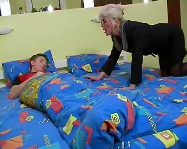 Mature with Silver Hair Glasses and Stocking Wakes the Stud