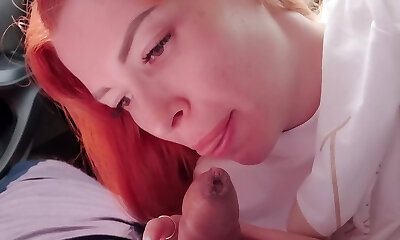 Fledgling POV video of a shy redhead gargling a dick in the car