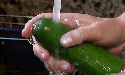 一个绝望的家庭主妇使用黄瓜和胡萝卜作为一个大的硬公鸡的替代品